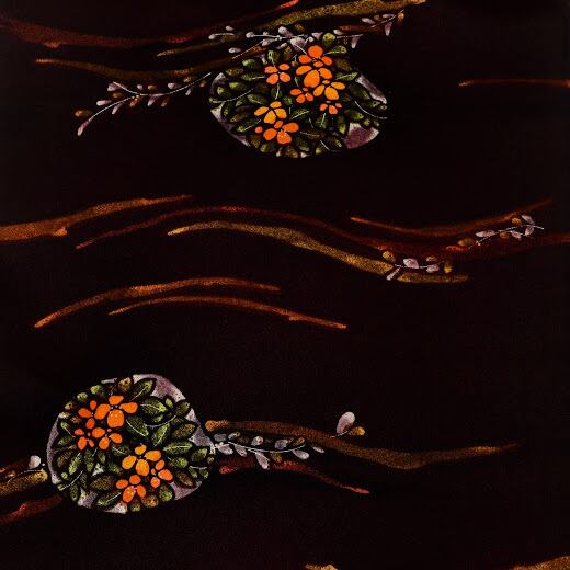 黒っぽい小豆色の地色に流れる線は風や波のよう